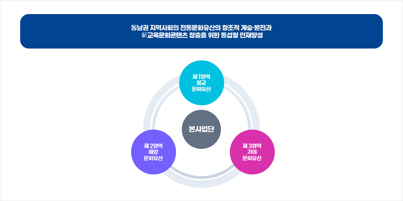 본 사업단은 동남권 지역사회가 필요로 하는 인재상을 목적으로, 불교문화유산, 해양문화유산, 가야문화유산을 중심으로 교과목을 구성하여 실시 중에 있습니다.